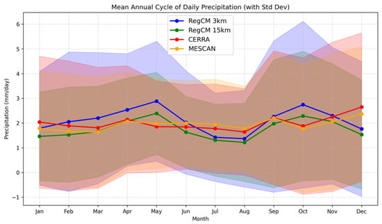 Mean annual cycle of daily precipitation over Bulgaria for the period 1995–2004, with standard deviation shading (mean ± standard deviation). The comparison includes two model simulations—RegCM at 3 km (blue line) and 15 km (green line)—and two observational datasets—MESCAN (yellow line) and CERRA (red line).