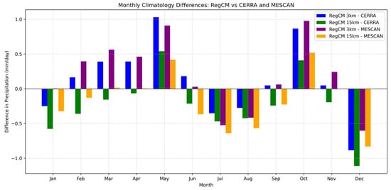 Monthly precipitation differences between the two RegCM model simulations and two reference datasets (CERRA and MESCAN).