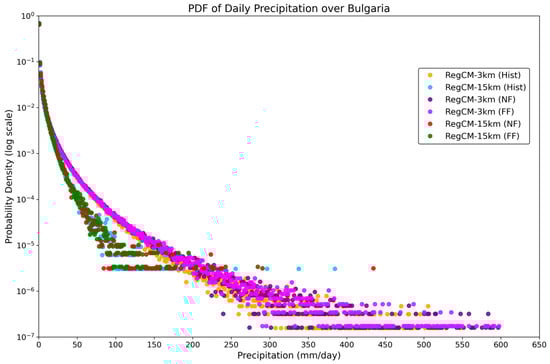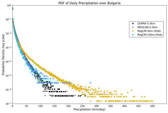 An important aspect of precipitation characteristics is the distribution of precipitation intensity, which can be assessed using probability density functions (PDFs). PDFs of daily simulated and observed precipitation over the study region are presented in Figure 6. All datasets are shown on their native grids. The highest observed daily precipitation values in the tails of the PDFs range from approximately 120–260 mm/day for MESCAN and 140–260 mm/day for CERRA (Figure 6, gray and black markers, respectively). The kilometer-scale simulation exhibits more frequent and more intense precipitation events (Figure 6), but fewer occurrences of moderate precipitation below 20 mm/day. The most intense events, exceeding 260 mm/day, are produced by the RegCM 3 km simulation, which also shows a generally higher frequency of events exceeding ~40 mm/day compared to MESCAN and CERRA.