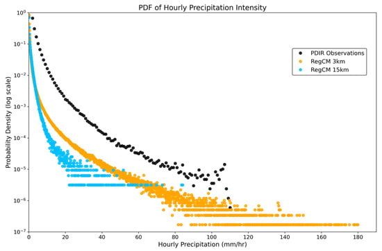Figure 9 presents the hourly precipitation probability density functions (PDFs) from simulations and observations. All datasets are shown on their native grids. Both models tend to underestimate precipitation compared to the observational datasets. The regional climate model (RCM) overestimates the frequency of light precipitation but underestimates precipitation events exceeding 20 mm/hour relative to CPRCM (Figure 9). The convection-permitting regional climate model (CPRCM) captures the most extreme precipitation events above 110 mm/hour. The highest observed hourly precipitation values in the PDF tails range from approximately 70 to 110 mm/hour in the PDIR dataset (Figure 9, black dots). The strongest extremes, exceeding 120 mm/hour, are simulated by the RegCM 3 km model, which generally produces higher frequencies of intense precipitation than the coarse-resolution model at intensities above ~5 mm/hour.