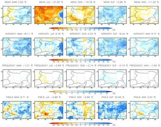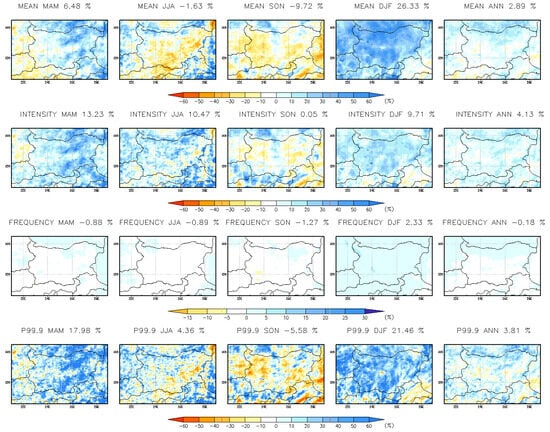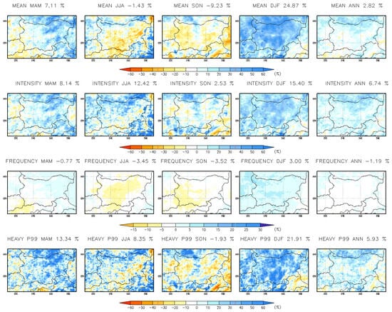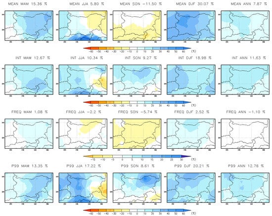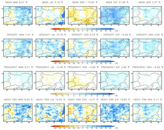 Seasonal and annual mean change (%) in daily precipitation indices at 15 km resolution for the far-future period 2090–2099.