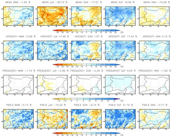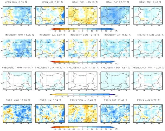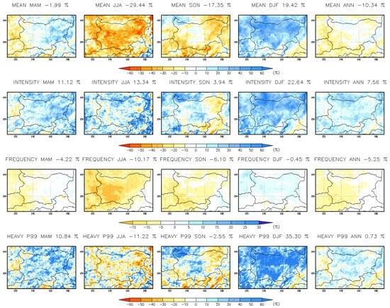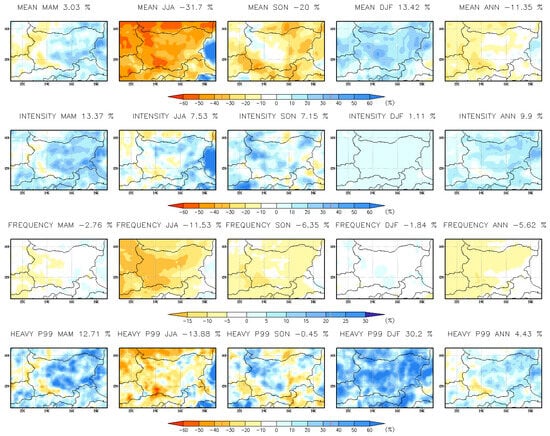 The results from the simulations suggest notable changes in precipitation patterns in Bulgaria, with both near- and far-future periods showing significant shifts. For the near-future (2041–2050), the projected increase in annual and seasonal precipitation across Bulgaria, particularly in the northern regions, highlights a trend of intensified precipitation events. This is especially pronounced during the winter and spring months, where mean precipitation, intensity, frequency, and heavy precipitation indices all show increases. The results are consistent with previous studies [,]. The most striking change is in the March–April–May (MAM) period, where heavy precipitation is expected to rise by 30% in northeastern and southeastern Bulgaria, signaling a higher risk of extreme weather events, especially in these regions. In contrast, the summer (JJA) and autumn (SON) months show a general decline in precipitation frequency, with a noticeable decrease in mean precipitation. However, extreme precipitation events (p99) are expected to intensify in both summer and autumn, particularly in the northern and coastal areas. These shifts in precipitation patterns indicate a more irregular distribution of rainfall, with increased occurrences of extreme events, such as heavy rainfall, in certain regions. The results are in line with previous works [].