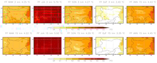 This section presents the projected changes in near-surface air temperature over Bulgaria, based on annual and seasonal averages for the near-future (2041–2050) and far-future (2090–2099) periods, relative to the historical baseline (1995–2004). The analysis includes spatial maps illustrating the geographic distribution and magnitude of temperature changes across the country. Understanding these temperature shifts is crucial for assessing broader climate change impacts, especially those affecting snow cover, growing seasons, and heat-related extremes, which depend on both long-term warming trends and seasonal variations. Figure 20 shows the seasonal and annual mean 2 m temperature changes for the period 2041–2050 using both the 3 km CPRCM and 15 km RCM, while Figure 21 presents the results for the period 2090–2099. The temperature changes are similar between the two resolutions. Area-averaged values are provided in Table 6. For the near-future period, projected temperature changes are approximately 1.6 °C in DJF, 2.2 °C in JJA, 1.9 °C in SON, 1.7 °C in DJF, and 1.9 °C annually. For the far-future period, projected changes are approximately 3.4 °C in DJF, 4.3 °C in MAM and SON, and 4.5 °C annually.