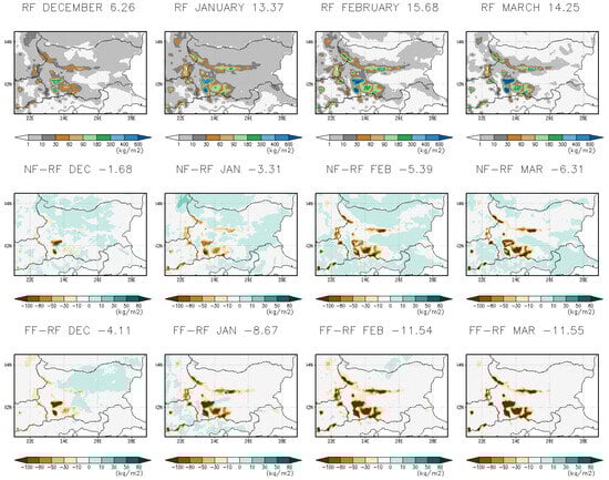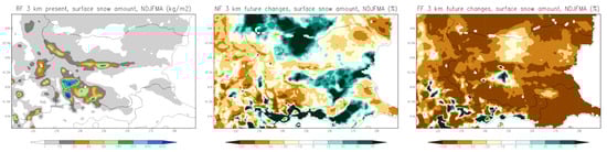 The annual mean historical surface snow amount (kg/m2) and projected percentage changes for the near-future (2041–2050) and far-future (2090–2099) periods, considering the months November through April (NDJFMA), are presented in Figure 22. For the near-future period, an increase in surface snow is observed in the central Danubian Plain, Thracia Lowland, and parts of the Rila and Pirin mountains. However, for the far-future period, surface snow is expected to decrease significantly in lowland areas by the end of the century. Figure 23 and Table 7 display the monthly mean surface snow amounts for the historical period (first row), as well as projected changes for the near-future (2041–2050, second row) and far-future (2090–2099, third row) in December, January, February, and March. The units are in kg/m2. Overall, a decline in snow is projected across all months.