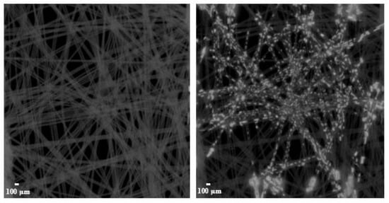 It is assumed that liquid deposition within the filter media occurs through two primary mechanisms. The liquid can either be accumulated primarily around the fibers in the form of droplets, which can partially coalesce into a liquid film, or it can be retained at the contact points between fibers. The challenge here is that water is not visible in the µCT, and in the dried state, it is not possible to observe where the water was originally accumulated. The deposition of droplets in filters was successfully recorded in other work for oil using µCT [,,]. To overcome this limitation, a contrast agent was introduced, which remains visible in µCT images after drying. A small section (approx. 5 mm × 5 mm) was prepared from the middle layer of filter A and subjected to µCT imaging. A droplet with a diameter of approx. 2 mm, which contained a contrast agent in the form of a potassium iodide solution (Lugol’s Liquor, PanReac AppliChem, Prod. Code: 257041, AppliChem GmbH, Darmstadt, Germany), was applied to the sample’s center using a dosing pipette and permeated within a few minutes. After a sufficient drying period of 24 h at room temperature (approx. 20 °C), the sample was tomographed again. Figure 1 shows a comparison of the fiber structure before and after application of the contrast agent droplet.