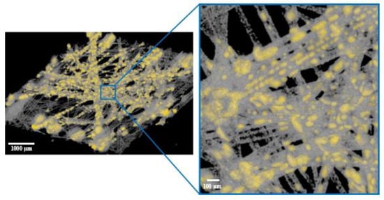 For better visualization, Figure 2 presents a 3D image of the sample section with the contrast agent (yellow), created from the µCT image shown in Figure 1.