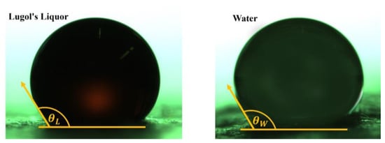 As the main component of Lugol’s Liquor is 85% water (density: 1112 kg/m3), its properties should closely resemble those of water. In the contents of the experimental investigations, the wettability of the used liquid to the filter material is an important property. In order to investigate this characteristic, the contact angles of Lugol’s Liquor and water with the filter material were measured. Single droplets (0.1–1 µL) were carefully deposited on the filter material using an Eppendorf pipette, and high-resolution images were captured for analysis. Figure 3 shows the comparison of contact angles for the middle layer of filter A.
