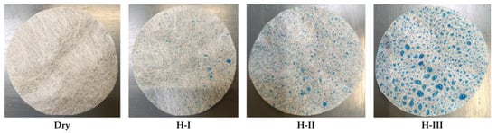 To simulate varying levels of humidity exposure, the samples were sprayed with water using a spray bottle, creating three distinct humidification conditions: humidification I (H-I), humidification II (H-II), and humidification III (H-III). As the humidification level increased from H-I to H-III, the amount of water retained, and thus the gravimetric water content, also increased. Figure 4 shows the different humidification cases for the middle layer of filter A, where the water was colored blue to enhance the visibility of its distribution on the surface. The “dry” case corresponds to a new filter that has not been humidified.