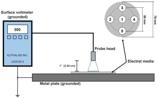 The test rig used for the experimental investigations is shown in Figure 5. The sample was placed on a grounded metal plate, the five marked measuring points were scanned using the probe head of the surface voltmeter, and the potential was measured. The distance between the probe head and the electret media (sample section of the filters) was set to 1 inch (2.54 cm), in accordance with the manufacturer’s recommendations (AlphaLab Inc., Salt Lake City, UT, USA).