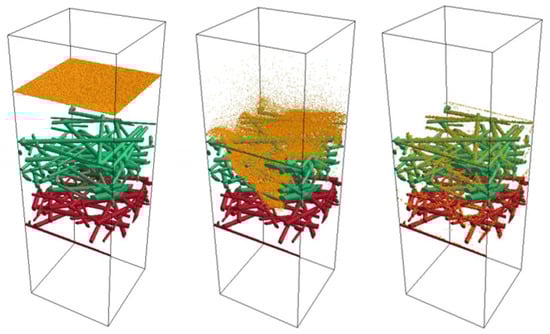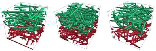 The 3D microstructure of the filter media was generated within the simulation using a mathematical algorithm developed in a previous work [,]. Cylindrical fibers with a specified diameter distribution were randomly generated within a closed volume perpendicular to the flow direction until the required porosity was achieved.