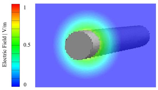 where is the spatial position in the void domain, the surface integration variable and the permittivity of the vacuum. The electric field was calculated up to a distance of approximately 1.5 times the fiber diameter into the pore volume []. The strength of the electric field, therefore, decreases as the distance from the fiber surface into the pore volume increases. Figure 8 shows the calculated electric field of a single fiber (diameter: 10 µm, voxel length 1 µm) with a surface charge density of 25 µC/m2.