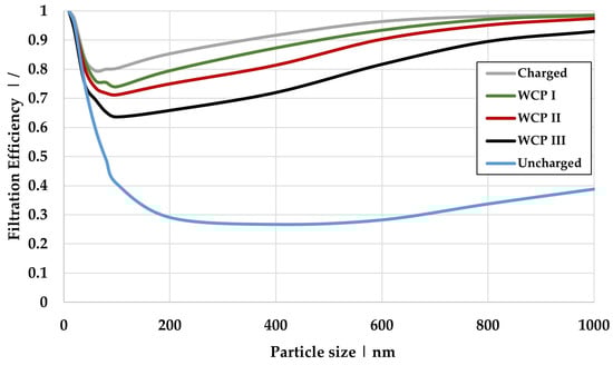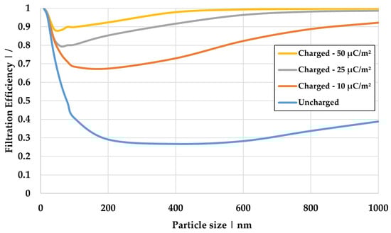 Figure 13 presents the calculated filtration efficiency for the charged (dry case), uncharged (absence of an electric field), and the three scenarios, where water is present at fiber contact points. The data correspond to a surface charge density of 25 µC/m2 and cover the particle size range of 10 to 1000 nm.