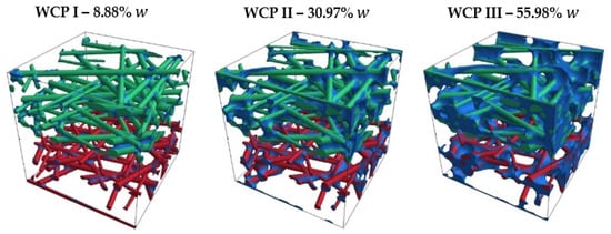 The water content at contact points of fibers was varied for the three different cases: WCP I–III (WCP: Water in Contact Points). Table 8 presents the gravimetric water content and the percentage of pore-filling by water (the volume of water was related to the free pore volume in the dry fiber structure) for Models 1, 2, and 3. In these models, the volume fraction of the fibers remains constant, while an increase in water content results in a corresponding decrease of the air volume fraction. The generation of the water quantity depends on the fiber geometry of the model and, in particular, the number of fiber crossings or contact points present.