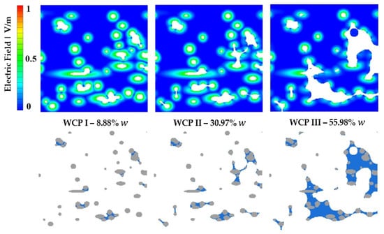 Figure 12 shows a comparison of the electric field between the three wet cases (WCP I, II, and III), demonstrating the impact of differing water content at fiber contact points. The sectional view corresponds to the center of the model.