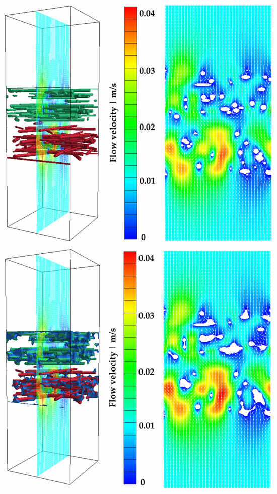 Flow field for Model 1 at an inflow velocity of 0.01 m/s and at a surface charge density of 25 µC/m2. Top: dry case; bottom: WCP II (30.97% water content).