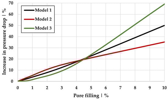 Increase in pressure drop and pore filling for Models 1, 2, and 3 at a constant inflow velocity of 0.01 m/s.