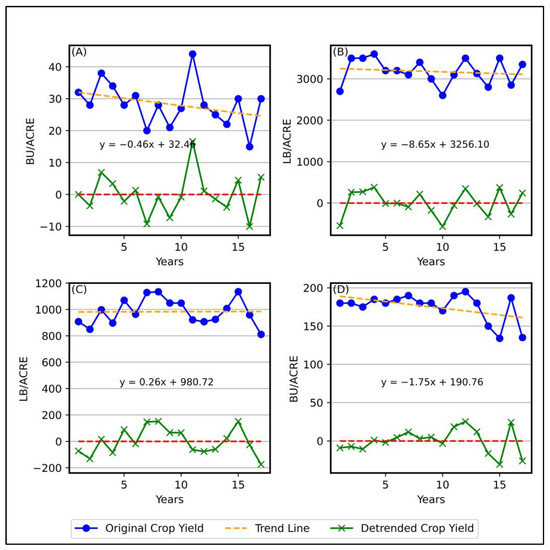 - Lu, J.; Carbone, G.J.; Gao, P. Detrending Crop Yield Data for Spatial Visualization of Drought Impacts in the United States, 1895–2014. Agric. For. Meteorol. 2017, 237–238, 196–208. [Google Scholar] [CrossRef]