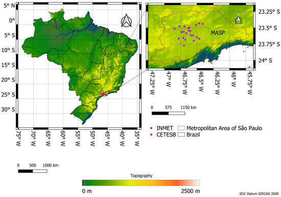 Study area. The location of the MASP in Brazil is presented on the left side, and on the right side, the MASP is presented in detail. The purple dots represent the location of the CETESB air quality and meteorology stations considered in this study, and the red dots represent the location of the INMET weather stations.
