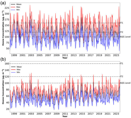 Monthly maximum (a) and mean (b) MD8A-O3 values (in µg.m−3) for the Megacity of São Paulo, based on data recorded between 1998 and 2023 at 20 stations. In each panel, the bottom line represents the lowest value among stations (minimum of the maximum in (a); minimum of the mean in (b)), the middle line indicates the mean among stations, and the top line shows the highest value among stations (maximum of the maximum in (a); maximum of the mean in (b)). Dashed lines indicate the Air Quality Guideline (AQG) value and the Interim Targets (IT-1 and IT-2) recommended by the WHO (2021) [51].
