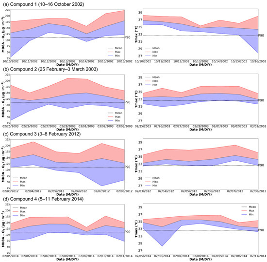 From September to March, the daily average of MD8A-O3 and Tmax values (average of all sites with valid data on a specific day) were compared to the p90 megacity average threshold. Although different methods can be used to identify heatwaves, in this study, heatwave events were considered when Tmax values were higher than the p90 threshold for 6 consecutive days, as described by Curado et al. (2023) [58] and by Molina et al. (2020) [6], who analyzed heatwaves in subtropical Brazil. The same method was applied to define O3 extreme events. Hence, compound heatwave and O3 extreme events were identified when the p90 threshold values for MD8A-O3 and Tmax were exceeded at the same time for at least 6 consecutive days.