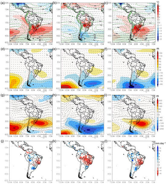 (a–c) Mean sea level pressure (hPa, green lines), temperature at 2 m anomaly (°C, in color), and wind at 850 hPa (m.s−1, arrows); (d–f) anomalies of geopotential height (m, in color) and wind (m.s−1, arrows) at 850 hPa; (g–i) anomalies of geopotential height (m, in color) and wind (m.s−1, arrows) at 250 hPa; (j–l) precipitation anomaly (mm.day−1, in color). Figures in the first column (a,d,g,j) represent the composition considering only days during the heatwaves, in the second column (b,e,h,k), days during ozone extreme events, and in the third column (c,f,i,l), the atmospheric patterns during the compound events.