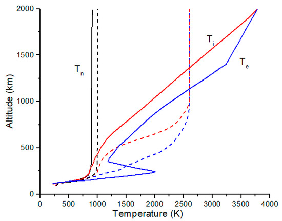 Neutral, ion, and electron temperature profiles from the International Reference Ionosphere model [16] at 20° N (solid lines) and for typical mid-latitude conditions from an older model [15] (dashed lines). Neutral gas temperatures (black) reach 800–1000 K above 300 km, while the ion (red) and electron (blue) temperatures reach 2600–3800 K. Ion temperatures are collisionally coupled to the neutral gas temperature below about 200 km.