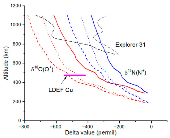 Computed δ15N and δ18O profiles for N+ and O+ assuming diffusive equilibrium and the temperatures profiles in Figure 2. The isotope delta-values are computed relative to atmosphere at the ground for δ15N (blue curves) and relative to Vienna standard mean ocean water (VSMOW) for δ18O (red curves). Diffusive separation favors the light isotopes in the upper ionosphere. Ion number densities were computed using Equation (1) and for the assumption of a peak density at 200 km (dotted or dashed lines) or 300 km (solid lines). The results for the IRI temperature profiles (Figure 2) are also shown (red and blue dashed lines). The measured isotope ratios from Explorer 31 (dark (δ18O) and light (δ15N) gray dashed lines) from reference [3] also exhibit very light values but with a different altitude dependence compared to the computed profiles. This is possibly a result of additional photochemical fractionation processes or could be due to unspecified measurement uncertainties in the Explorer 31 mass spectrometer. An oxygen isotope measurement from LDEF Cu targets provides an independent illustration of the effects of diffusive separation [17].