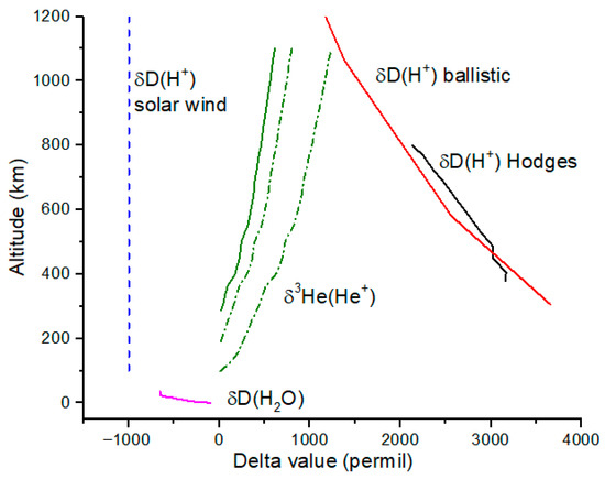 The delta-values profiles for H+ in Figure 4 are from ballistic trajectories computed by Hodges (1998) [11]. Also shown are satellite measurements summarized in reference [11]. H isotope δ-values in the lower atmosphere below the homopause are highly enriched in D compared to ocean water due to preferential escape of H. Diffusive separation causes a reversal in this trend above the homopause. Deuterium has never been detected in solar wind to within an upper limit of 0.2 ppm; hence, δH of H+ is nearly −1000‰, the minimum possible value (Figure 4).