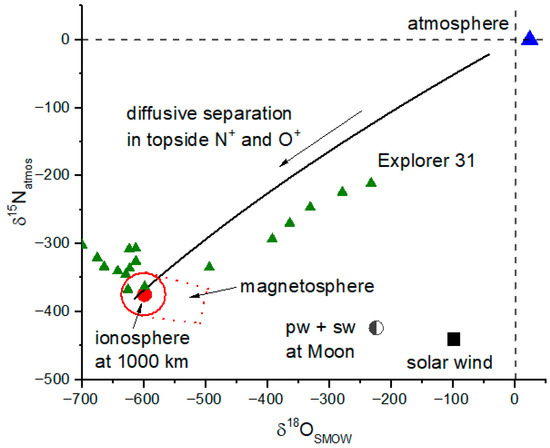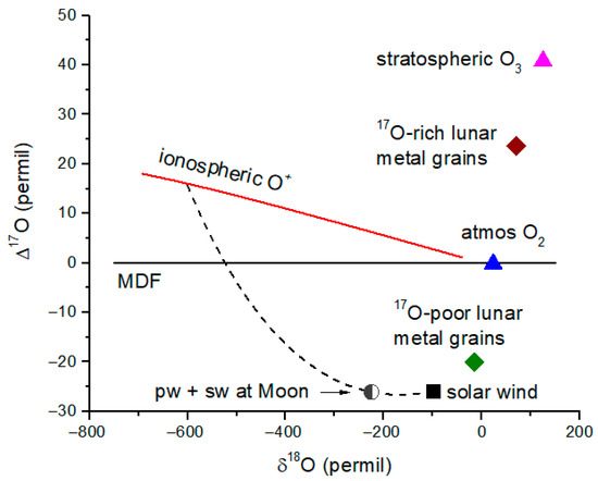 δ18O and Δ17O for polar wind, solar wind and several other relevant O reservoirs. MDF is the mass-dependent fractionation line. 17O-poor lunar metal grains from reference [23]; 17O-rich lunar metal grains are from reference [24]. Diffusive separation (red line) causes gravitational fractionation that has an exponent of 0.500 instead of 0.528 in Equation (5) [14]. A mixing line (dashed line) connects the ionosphere at 1000 km to the solar wind. ‘pw + sw’ has 75% solar wind weighting. No combination of ionosphere and solar wind O+ can account for the 17O-rich lunar grains. The large 18O depletion due to diffusive separation argues against significant contribution of polar wind to the lunar regolith.