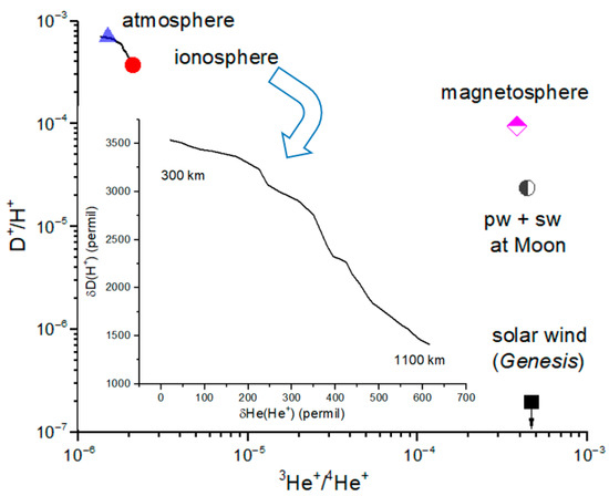 D/H vs. 3He/4He for the ionosphere, solar wind and magnetosphere. The inset figure shows δ-values for the ionosphere up to 1100 km. The δD values for H+ in the ionosphere are from model values in Hodges (1998) [11]. The δ3He values for He+ in the ionosphere are computed using Equation (6). The solar wind ratios (an upper limit) are from Genesis analyses [20]. The magnetosphere point is computed from Equation (7). The solar wind dominates the He+ isotope ratio in the magnetosphere, whereas the H+ isotope ratio is a blend of polar and solar wind values.