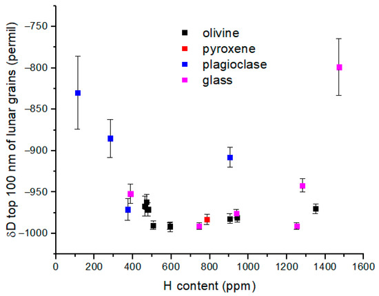 δD values from lunar samples collected by the Chang’E-5 mission as measured in several regolith mineral components [21]. This figure is made from data tabulated in reference [21]. Most of the samples exhibit very low δD values consistent with implantation of solar wind protons into lunar regolith grains. The δD error bars are 1-σ uncertainties.