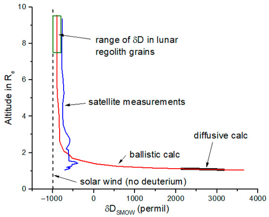 A weighted sum of the magnetosphere (25%) and solar wind (75%) values in Figure 5 and Figure 6 yield the points labeled ‘pw + sw at Moon’, where pw + sw means a weighted sum of polar wind and solar wind ions. For Figure 5, the pw + sw value is δ15N = −420‰ and δ18O = −225‰. Lunar samples this depleted in 18O have not been either seen or inferred to be present in lunar regolith. For the same weighting, H and He isotopes are predicted (Figure 6) to be very similar to a solar wind ratio for He isotopes and similar to some measurements of H isotopes in lunar silicate grains [21]. The pw + sw point in Figure 6 has δD = −850‰, similar to the most D-enriched values measured in lunar silicate grains (Figure 7) [21]. It is possible that polar wind protons are present at a measurable abundance in the lunar regolith. However, it must be noted that δD is predicted to decrease rapidly for H+ in the upper ionosphere and into the plasmasphere according to model calculations from Hodges et al. (Figure 8) [11], in which case it becomes more difficult to distinguish polar wind protons from solar wind protons based only on D/H ratio in lunar grains.