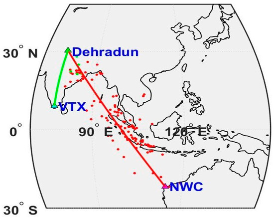 In order to confirm that observed events are indeed due to D-region scattering, we directly identified these events in the VLF signal based on their specific pattern in the VLF signal (step-like event). Further, the events were also confirmed with WWLLN lightning data such as the location, timing, and energy of the causative lightning events along the TRGCP. We used two transmitter–receiver great circle paths to verify that the observed events were path-specific, confirming a regional ionospheric disturbance. We identified lightning strikes occurring within 1000 km of the transmitter–receiver great circle path (TRGCP) for both transmitters using WWLLN data [22] in order to correlate them with the observed VLF events. The details of the TRGCP between the VLF receiving stations at DDN and the VLF navigational transmitters NWC and VTX are shown in Figure 1.