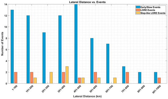 In the present study, a total of 107 VLF events were examined. Of these, 15 (14.01%) were found to be linked to narrow-angle scattering, while 92 (85.98%) were attributed to wide-angle scattering. As demonstrated in Figure 3, the lateral distance of lightning strikes from the transmitting station serves as an indicator of their geographical position and the potential for these lightning strikes to contribute to VLF events. From Figure 3, it can be seen that the maximum number of early/slow events is associated with lateral distances in the range of 200–500 km and falls under wide-angle scattering. Similar conditions are also observed for the other two types of event, i.e., LOREs and step-like LOREs.