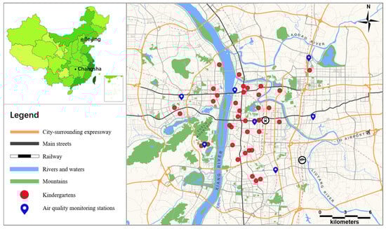 Distribution of 36 kindergartens and seven air pollution monitoring stations in Changsha.