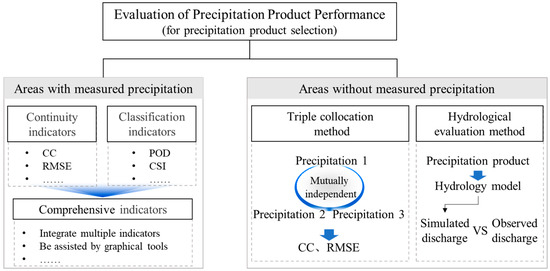These evaluation indicators require computations at locations where measured values serve as the baseline. Therefore, it is difficult to analyse the quality and performance of precipitation products in areas without rainfall gauges, as well as the performance of precipitation products in monitoring areal precipitation and spatial distribution of precipitation in areas with sparse rainfall gauges. Two primary methods are utilised to address this issue. The first is the triple collocation (TC) method [28] and its enhanced variants [29,30]. These approaches estimate the RMSE and CC of each product by analysing pairwise covariances among three mutually independent precipitation datasets. Roebeling et al. [31] were the first to apply the TC method to assess the performance of precipitation products. The second method is hydrological evaluation [32]. This technique compares the simulated discharge of hydrological models driven by precipitation products against observed discharge, indirectly assessing the spatiotemporal accuracy of precipitation products using metrics such as the flood peak error and Nash–Sutcliffe efficiency of discharge series. Additionally, it assesses the hydrological utility of precipitation products in regions with abundant rainfall data. In summary, the performance evaluation of precipitation products should adopt different methodologies based on data availability conditions (as shown in Figure 1). For areas with ground-based rainfall measurements, assessment can be conducted using continuous metrics, categorical metrics, or comprehensive composite indicators. For regions lacking rain gauge data, evaluation should rely on either the triple collocation method or hydrological evaluation approaches.