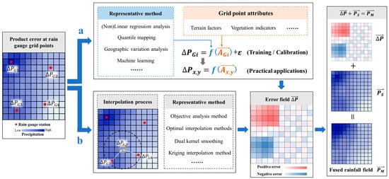 The second category addresses the spatial expansion of precipitation product errors, which involves estimating the error field of the precipitation product, and subsequently adjusting the precipitation product accordingly. Prominent methods in this category comprise the objective analysis method [45], optimal interpolation methods [46,47], dual kernel smoothing [48], and kriging interpolation method [35]. As illustrated in Route b of Figure 2, the error field estimated by these representative methods is fused with the precipitation product’s rainfall field to produce the corrected precipitation estimates. Yan et al. [49] assessed the spatial error field of IMERG by evaluating product discrepancies at grid points using rainfall gauge data and kriging interpolation within the Hanjiang River Basin. By overlaying the error field onto IMERG, they significantly enhanced the accuracy of daily precipitation measurements in the basin. Baez-Villanueva et al. [50] summarised the key steps of these methodologies and their application impacts across different regions through comparative tables.
