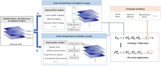 Fusion methods are primarily categorised into two types. The first type includes weighted averaging techniques, such as inverse RMSE weighting [56], optimal weighting [54], and Bayesian model averaging [57]. As illustrated in Route a of Figure 3, these representative methods are employed to train and determine the fusion weights at locations with rain gauges, followed by the integration of multi-source precipitation products at ungauged sites. Zhu et al. [56] employed a morphologically adaptive approach to identify rainfall events in both temporal and spatial dimensions. They integrated multisource precipitation data at grid points lacking rainfall gauges by using the reciprocal of the root mean square error of precipitation products against gauges as weights. Similarly, Hong et al. [58] determined fusion weights of each grid using an artificial neural network. The covariates in the neural network included elevation, barometric pressure, and wind speed at each grid point, resulting in fusion weights that vary spatially and temporally.