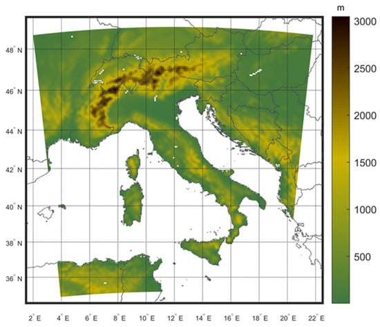 In this study, a preliminary experiment was carried out by using ERA5 as forcing [12], which is a high-resolution global reanalysis dataset by the European Centre for Medium-Range Weather Forecasts (ECMWF). It is characterized by a spatial resolution of 0.25° (about 31 km) and a temporal coverage from 1940 to the present. The quality of this dataset makes it ideal for providing perfect initial and boundary conditions to RCMs, enabling the study of localized climate phenomena with great accuracy. The simulation covers the period 1979–2010 and uses the computational domain (2–22° E; 35–49° N) shown in Figure 1. The grid is characterized by a spatial resolution of 0.0715° (about 8 km) and has 185 × 195 grid points. The time integration is based on a third-order Runge–Kutta scheme, convection is parameterized using the Tiedtke scheme [13], while the number of vertical levels in the atmosphere and the number of soil levels are set at 40 and 9, respectively. The sponge zone is made up of 15 grid points.