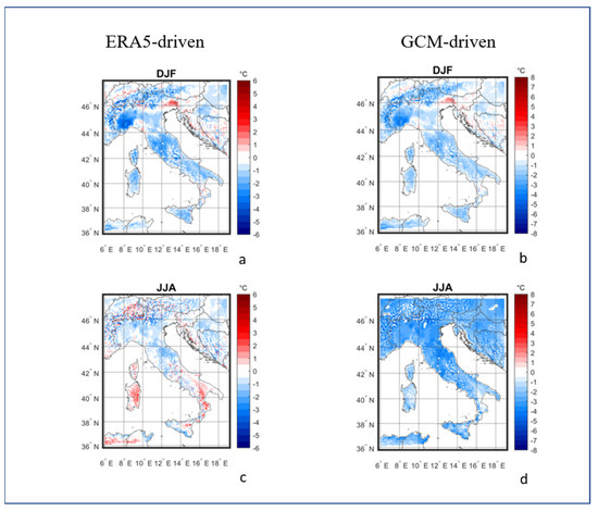 This section is devoted to the quality assessment of climate model data. The mean 2 m temperature (T_2m) seasonal bias distributions over the period 1981–2010 are shown in Figure 2, for winter (DJF) and summer (JJA), respectively, for ERA5- (a–c) and GCM EC-EARTH- (b–d) driven simulations. The color scale indicates temperature bias in °C, with blue showing areas where the model underestimates temperature and red for overestimations. For ERA5-driven, a pronounced underestimation is recorded in winter over the Alps, potentially due to difficulties in simulating complex topography or snow-albedo feedbacks. Smaller biases are observed in southern Italy and islands. In summer, a slight temperature overestimation is visible in southern Italy and Sardinia, which might reflect challenges in simulating heatwaves [21], soil moisture dynamics, and urban heat effects [22]. An underestimation persists on northern and central Italy. For GCM EC-EARTH-driven, panels b-d suggest that COSMO-CLM generally is affected by a cold bias across Italy, with intensity depending on the season. In winter, the cold bias is particularly pronounced in northern Italy whereas minor overestimations (red areas) are visible in limited regions, such as north-eastern Italy. The cold bias is stronger during JJA, suggesting that the model has difficulties simulating warmer temperatures; coastal regions and islands show smaller biases compared to inland and mountainous areas. This general cold bias is inherited by the driving GCM, in fact the temperature underestimation by the EC-Earth model over Italy (and other specific regions) has been reported in some analyses and scientific publications. As regards bias in summer temperatures, recent studies (e.g., [23]) have indicated that EC-Earth tends to underestimate temperatures in Italy and other areas of the Mediterranean, and that this could be due to an incomplete representation of the feedback between dry soil and high temperatures. Regarding the topographic influence, the complex orography of Italy may be too simplified in the model, leading to an underestimation of temperatures in certain areas (e.g., plains or coastal regions). The latest version of EC-Earth has improved spatial resolution and the representation of certain key processes, reducing some biases. However, the extent of these improvements may vary depending on the model configuration (e.g., atmosphere–ocean coupling, and the resolution used). A recent study [24] analyzed the very high-resolution configuration of the EC-Earth model for “The High-Resolution Model Intercomparison Project (HighResMIP)”, comparing it with lower-resolution versions. The results indicate that, despite improvements in the representation of certain climatic phenomena, biases persist in the simulations of summer temperatures in Europe, highlighting the need for further refinements in the model. Table 1 reports the values of the BIAS index for the performance evaluation of T_2m, averaged over the whole domain considered, for both simulations and seasons. These values confirm the good performances of the ERA5-driven simulation, even if some compensation effects may exist.