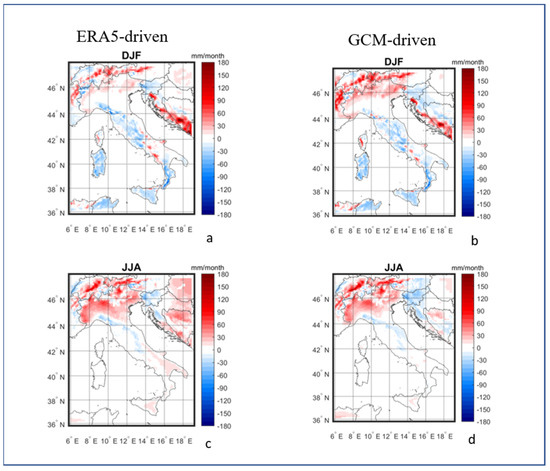Figure 3 shows the seasonal precipitation bias (mm/month) of the ERA5-driven simulation (a–c) compared to the E-OBS dataset for the period 1981–2010, with blue indicating an underestimation and red indicating an overestimation. In winter, a positive bias is recorded in the northern part of the domain, whereas negative biases affect the Apennines and southern Italy. In summer, precipitation is slightly overestimated in the north, which might be related to excessive convective activity simulated by the model. For GCM-driven simulations (b–d), results highlight strong spatial and seasonal variations, with notable differences in northern Italy compared to central and southern regions. In DJF, an overestimation is observed in the northern regions, particularly along the Alps whereas some underestimations occur in southern and central Italy. In JJA, northern Italy shows an overestimation, although the magnitude is reduced compared to winter. Underestimations are more widespread across central Italy, likely due to the model underestimating convective precipitation during the summer. BIAS values related to precipitation are also shown in Table 1, which confirm the good performances in winter and a relevant overestimation in summer, for both simulations.