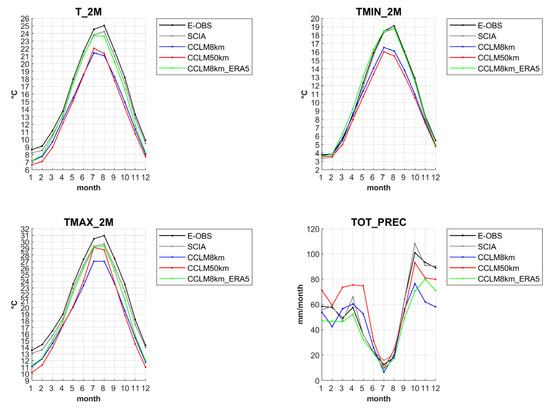 Annual cycle of 2 m daily mean (T_2m), minimum (Tmin_2m), maximum temperature (Tmax_2m) (°C) and total precipitation (Tot_Prec) (mm/month) for Roma Fiumicino airport: EC-Earth-driven simulations at 0.0715° and 0.44° (CCLM8km and CCLM50km) and ERA5-driven simulation (CCLM8km_ERA5) against E-OBS and SCIA datasets, averaged over the period 1981–2010.