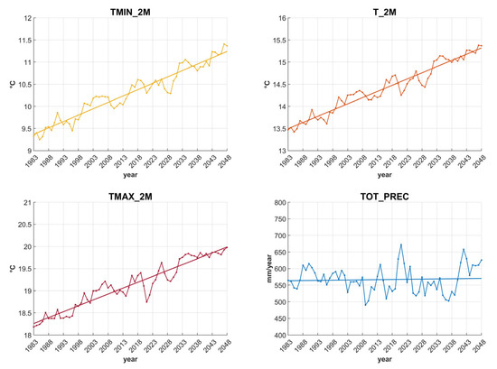 Climate projections have been performed under the IPCC RCP8.5 (Representative Concentration Pathway 8.5) scenario [25]. It is a high greenhouse gas concentration scenario, often referred to as a “business-as-usual”, which assumes a continued growth in fossil fuel use and limited mitigation efforts, resulting in a radiative forcing of 8.5 W/m2 by 2100. This scenario projects a significant increases in global temperatures, rising sea levels, and increasing extreme weather events, serving as a benchmark for understanding the potential impacts of unmitigated climate change. The significance of the projections was assessed by applying the Mann–Kendall nonparametric test, assuming a confidence level of 95%.