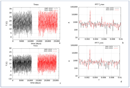 Time series of daily maximum and minimum T_2m over the periods considered (a,c) and corresponding mean power spectra obtained by FFT (b,d).