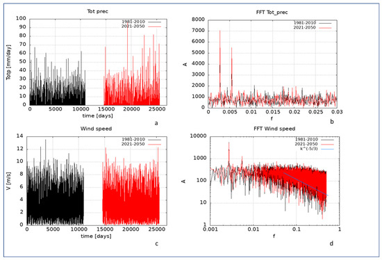 A daily time series of 2 m maximum and minimum temperature, total precipitation, and 10 m wind speed, covering the periods 1981–2010 and 2021–2050, were processed using an FFT to produce a power spectrum of the corresponding variables at regularly spaced bins, in order to measure the amounts of variability occurring in different frequency bands. The frequency resolution is 1/T0 = 0.912 × 10−4 (given that T0 is 10,957 d). The values of the main periods recorded (in days) for the variables considered are shown in Table 2. Figure 6a–c shows the time series of daily 2 m maximum and minimum temperature over the periods considered, while Figure 6b–d shows the corresponding mean power spectra. For Tmax_2m, a regular pattern in the time series can be observed, while three main peaks are visible in the power spectrum (f = 2.74 × 10−3, 5.48 × 10−3, 8.21 × 10−3), corresponding to periods of 365, 182, and 121 d, respectively. The first one corresponds to the annual cycle of temperature, dominated by seasonal variations. The second one refers to variations that are repeated every 6 months, reflecting temperature changes related to seasonal transitions (e.g., winter–spring and summer–autumn). Moreover, higher harmonic frequencies may arise if heating and cooling are not uniform over the year. Both past and future periods show a similar behavior at low frequencies, while at high frequencies (>0.005) a slight attenuation of the amplitude is observed in the future period. This could be related to a reduction in rapid (day-to-day) fluctuations, linked to a greater persistence of warm events or a more uniform climate on short time scales. For Tmin_2m, in both periods a similar trend is recorded for low frequencies (T = 365 d) with comparable amplitudes. At higher frequencies, amplitudes are slightly different for the two periods, suggesting a potential reduction of the fast variations in Tmin_2m in the future, with a more stable climate.