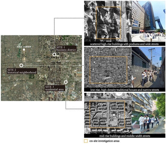 Three urban blocks representing the spatial forms of typical urban blocks in Beijing were selected as the study sites. They are the business district (BD), residential area (RA), and historical neighborhood (HN). The locations and street views of the selected urban districts are shown in Figure 2. BD is a newly developed modern urban block located 5 km east of the city center, with a spatial morphology of scattered high-rise buildings with podiums and wide streets. HN is a historical urban block located near the city center, which was developed during the late 19th and early 20th centuries, with a spatial morphology of low-rise but high-density traditional houses and narrow streets. RA was constructed in the 1990s and is located 9 km away from downtown areas. The spatial morphology of this block features mid-rise buildings and middle-width streets. All three blocks had two perpendicular street orientations: N–S and E–W.