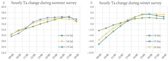 The thermal walk experiments were conducted in three selected urban areas over three days in summer and winter. The daily experiment was divided into three rounds—morning (R1), midday (R2), and afternoon (R3)—to ensure that the experiment captured the variations in temperature and solar radiation throughout the day. Table 1 lists the dates, locations, and time for each round on survey days. The time variation between two seasons was due to shorter daylight hours in winter. Clear sunny days were selected for the survey to ensure that the weather conditions were as close as possible to the typical meteorological days in Beijing in July and January. Figure 3 illustrates the hourly air temperature change pattern in survey days during two seasons. Due to considerations of labor and equipment costs, surveys at different locations were conducted on separate days. However, the selected survey dates shared similar climatic conditions, which helped to ensure the consistency of the experimental results as much as possible.