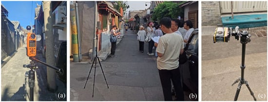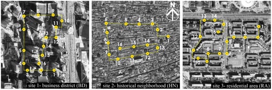 The route for each urban block contained 16 measurement points, as shown in Figure 4. The design of the routes and measuring points were optimized to ensure a variety of sun-exposure conditions and urban spatial forms. Specifically, in the BD area, points 1, 2, 3, 8, 9, and 13 were located along east–west-oriented streets; points 4, 5, 6, 14, 15, and 16 were situated on north–south-oriented streets; and points 7, 10, 11, and 12 were positioned at street corners or in open spaces in front of buildings. In the HN area, points 3, 4, 5, 10, 11, 12, 14, 15, and 16 were located on east–west-oriented streets; points 2, 7, 8, 9, and 13 were on north–south-oriented streets; and points 1 and 6 were positioned at street intersections. In the RA area, points 3, 4, 7, 8, 13, and 14 were located along east–west-oriented streets; points 1, 5, 6, 11, 12, and 15 were on north–south-oriented streets; and points 2, 9, 10, and 16 were situated at street corners or in open spaces near buildings. All measurement points were deliberately selected to represent locations with varying degrees of spatial openness. This ensured significant differences in solar radiation among the points at different times of the day, facilitating the analysis of the relationship between spatial morphology and thermal comfort. The Sky View Factor (SVF) values of each point in the two seasons are shown in Appendix A and Appendix B. The walking routine was properly designated to keep background environmental variables relatively stable, like surface material and anthropogenic heat, etc.
