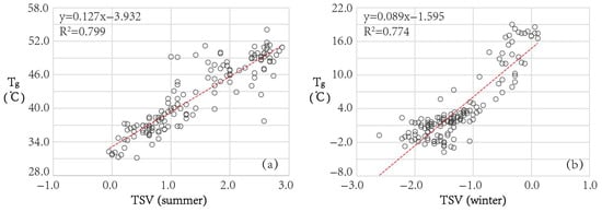 Regression results showing the relationship between TSV and Tg for (a) summer and (b) winter.