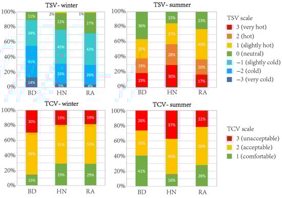 During winter, the OTC conditions in the three blocks differed significantly from those during summer. In BD, only 11% of respondents chose TSV = 0 (neutral), which was 11% and 16% lower than in HN and RA, respectively. Additionally, 14% of respondents in BD selected TSV = −3 (very cold), which was 9% and 10% higher compared to HN and RA, respectively. Furthermore, for the TCV options, the proportion of respondents in BD reporting discomfort was significantly higher than that in the other two areas, whereas the proportion reporting comfort was significantly lower. The mTSV in BD was 0.46 and 0.52 lower than HN and RA, while the mTCV in BD was also higher by 0.25 and 0.26 compared to HN and RA, respectively. These findings confirm that during winter, the OTC of BD was significantly poorer than that of HN and RA. In contrast, there were no significant differences between HN and RA indices.